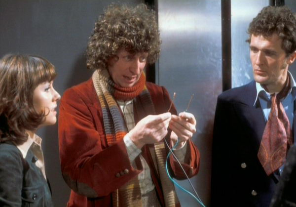 Sarah Jane Smith (Elisabeth Sladen), The 4th Doctor (Tom Baker) and U.N.I.T.’s own Dr. Harry Sullivan (Ian Marter) in a powerful scene from Genesis of the Daleks (1975)